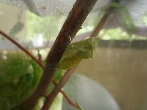 Posted on May 27, 2011January 3, 2017キアゲハの幼虫 蛹 raupe : day 4 昨夜、蛹化し、無事に蛹に。緑色の蛹。連れて帰って来てから、ほとんど食べなかったのはもうすぐこうなるからだったのかー。帯糸(たいし)でしっかりと体を固定。帯糸はリング状になっていて、その一部は体に溶け込まれているので、一方を切っても落ちないんだとか。幼虫の殻は、下に落とされている。今日は雨で気温もぐっと下がり、寒い。羽化予定日は6月8、9、10辺り。